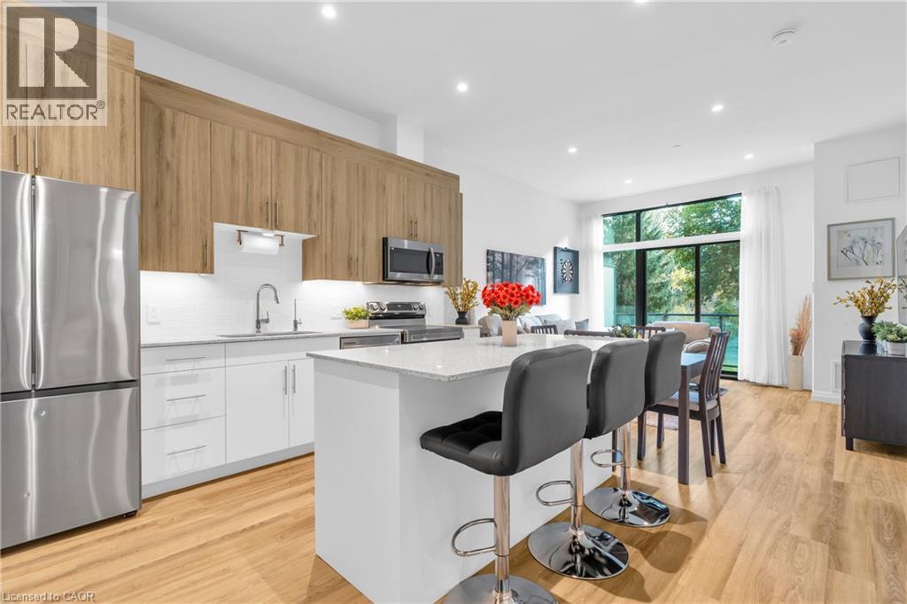 Welcome to 525 New Dundee Road, Unit 101. A modern and bright one-bedroom condo located on the main floor of a newly built building. This spacious unit features impressive 10-foot ceilings and a thoughtfully designed open-concept layout, creating an airy and inviting living space. Step out onto your private balcony, where you can enjoy peaceful views of the forest and walking trail just beyond. The stylish kitchen is equipped with stainless steel appliances, sleek cabinetry, and a reverse osmosis water system, offering both functionality and modern appeal. The living area is enhanced with power remote-control blinds, providing effortless comfort and convenience. This well-appointed unit also includes in-suite laundry, ample storage, and contemporary finishes throughout. Residents enjoy access to exceptional building amenities including a fitness centre, sauna, party room, library, pet wash station, and a beautifully designed outdoor patio with BBQs. Perfect for entertaining or unwinding. Ideally located just minutes from Highway 401, Conestoga College, shopping, restaurants, and scenic walking trails, this home offers the perfect balance of comfort, nature, and accessibility. A fantastic opportunity for first-time buyers, down-sizers, or investors looking for low-maintenance living in a growing community. (id:59491)